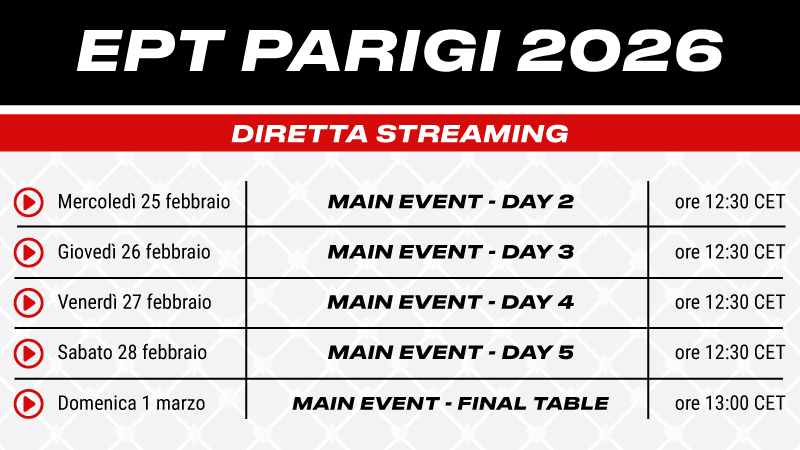Prima di passare alla mera cronaca di quello che è successo ieri, vogliamo subito darvi conto della diretta streaming che si terrà a partire da domani, mercoledì 25 febbraio, interamente in italiano, grazie alle voci al commento di Alberto Russo, Giada Fang e Pierpaolo Fabretti, pronti a raccontarci tutti i board dei tavoli televisivi, fino all’ultimo river che decreterà la vittoria di questo torneo, al termine del final day di domenica primo marzo.