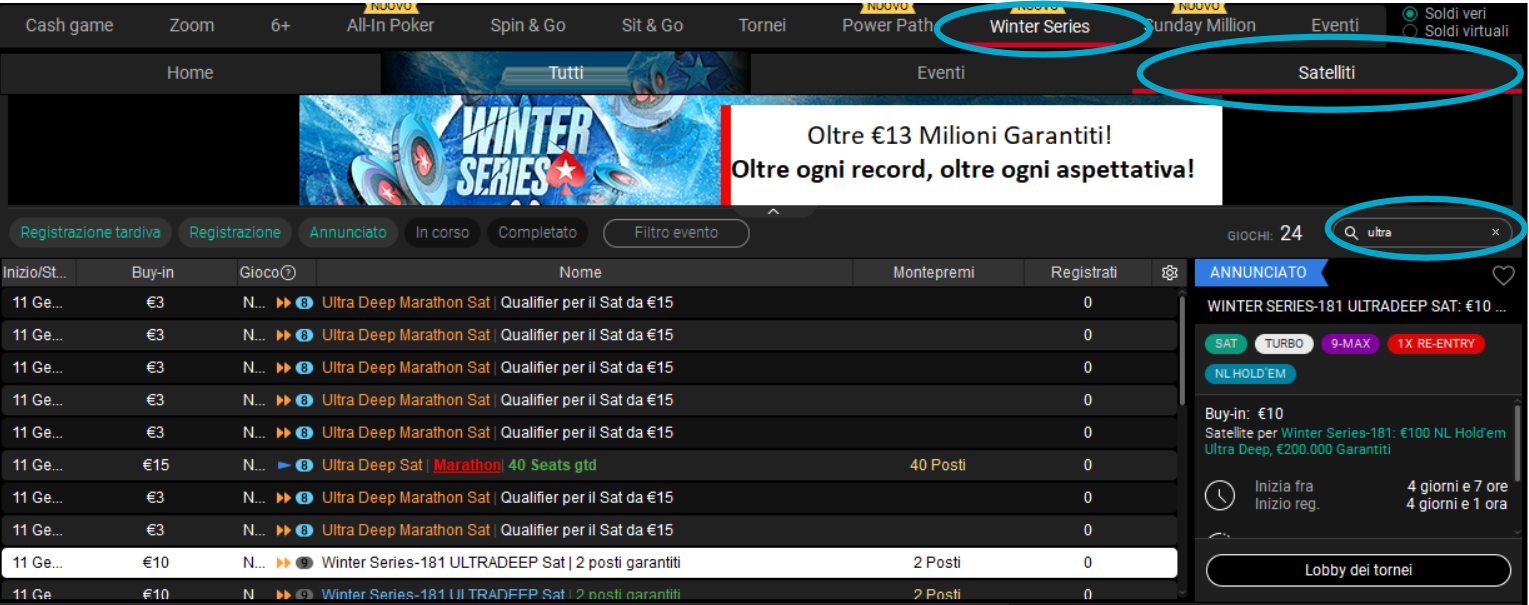 Per consultare l’elenco dei satelliti disponibili non devi far altro che andare nella scheda ‘Winter Series’ della lobby di PokerStars, poi nella sotto-scheda ‘Satelliti’ e digitare ‘ultra’ nel campo di ricerca tornei.