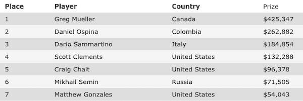 Sembra finita, quando MadGenius ritrova slancio (e carte) per risalire la china fino ad una sostanziale parità con gli altri due giocatori. Il torneo, con bui ormai altissimi, entra definitivamente in modalità “montagne russe” che alla fine premiano Greg Mueller. Sul gradino più basso del podio esce proprio Dario Sammartino, castigato dal canadese in una mano di Stud Hi-Lo. All’italiano sfugge ancora una volta il titolo WSOP, ma arriva una consolazione di $184.854.